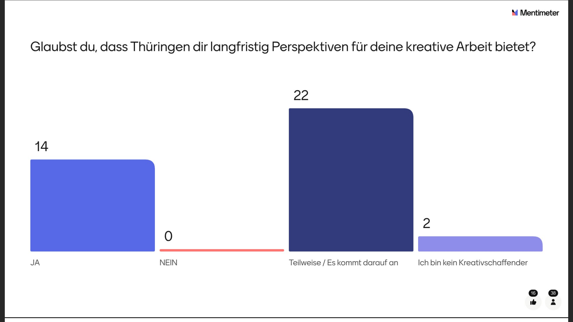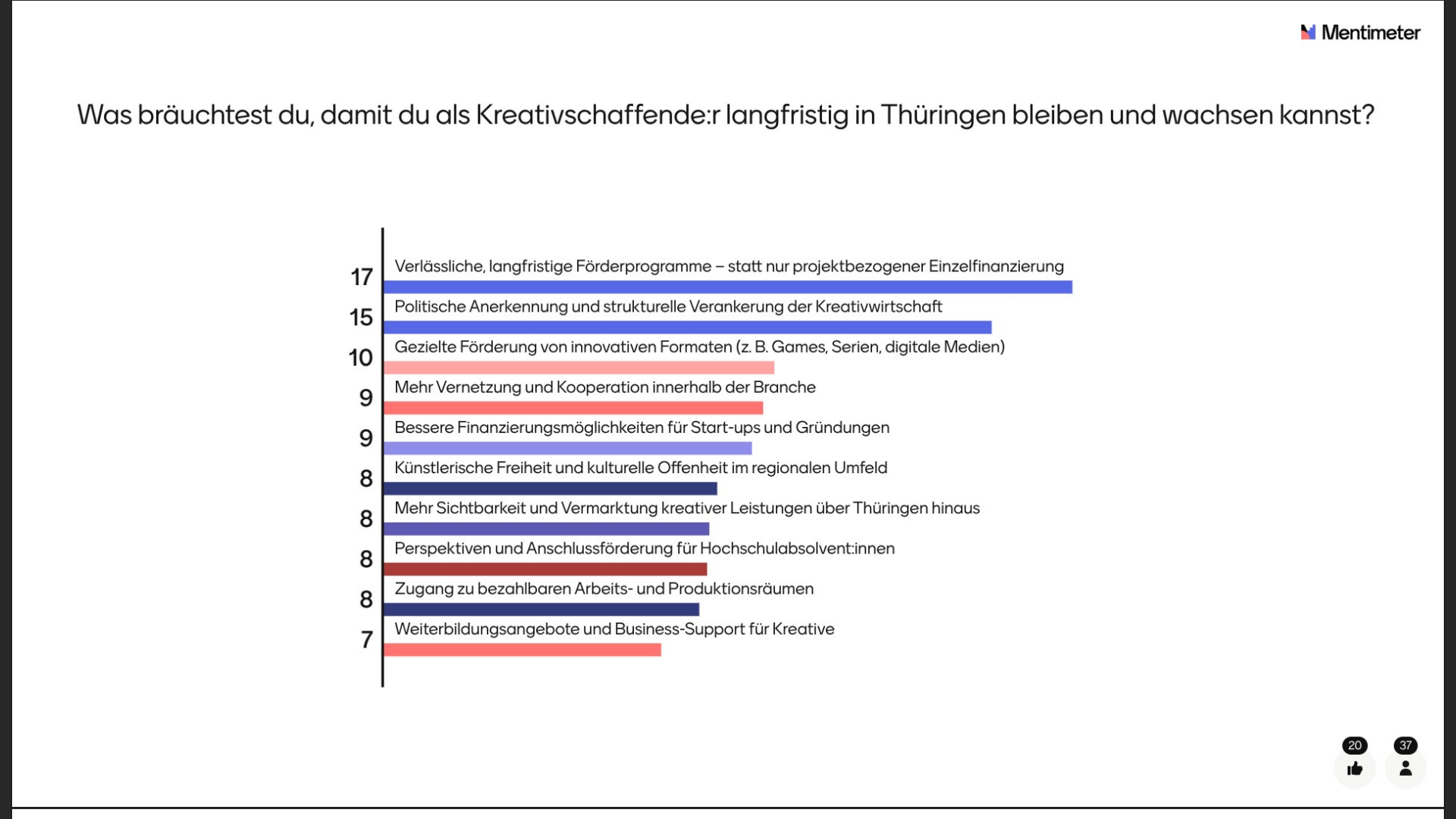 Ein weiterer Dank gilt allen, die an unserer Mentimeter-Umfrage teilgenommen haben! Die Ergebnisse bieten spannende Einblicke in die aktuelle Stimmung und die Herausforderungen der Games- und Kreativszene in Thüringen – nachzulesen auf unserem Discord!